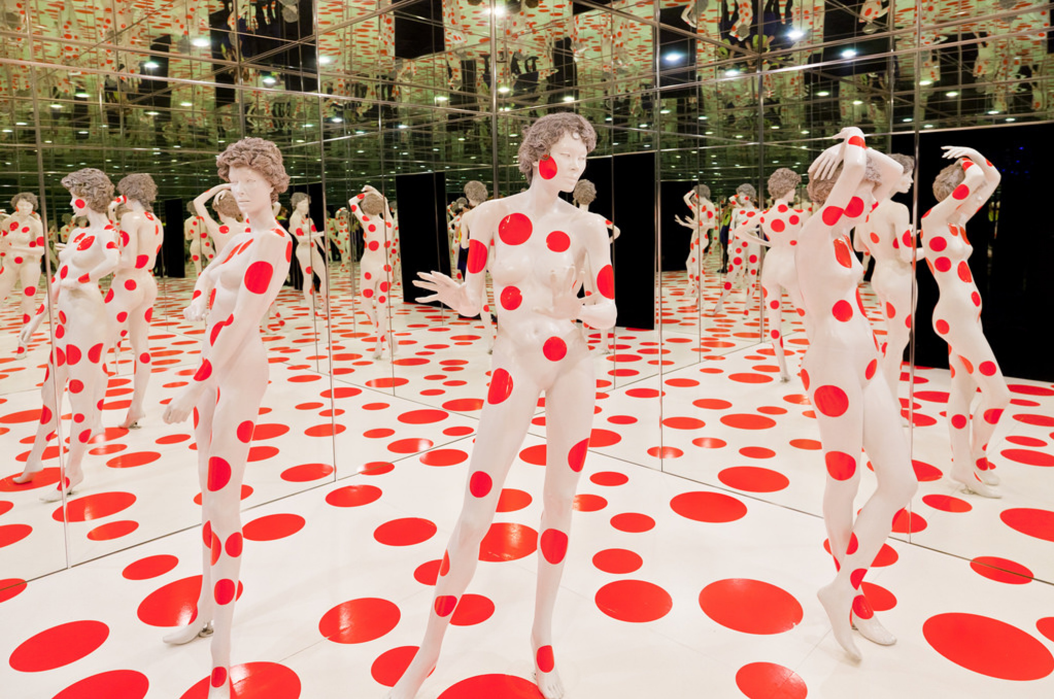 Идея создания бесконечных зеркальных миров, многократно отображающих содержание некоего замкнутого пространства, пришла к Кусаме в 1965 году. Ее первая инсталляция стала событием в мире современного искусства — это было действительно головокружительное зрелище. Здесь столкнулись сразу два страха художницы — горошки, покрывающие все видимое пространство, и поле фаллосов, которые они усеивали.