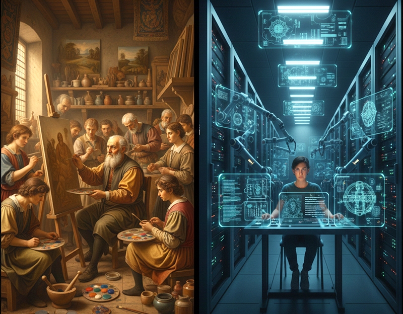 Нынешняя суета вокруг созидания и ИИ напомнила мне атмосферу и порядок вещей в стародавних художественных боттегах. У большого мастера всегда была толпа подмастерьев: кто-то растирал краски, кто-то прорисовывал фон. Мастер не делал всё своими руками, но он приносил в мастерскую замысел, мастерство и свою школу.