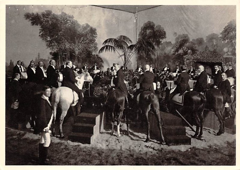 - Деталь: Гости не сидят на стульях. Весь банкетный зал застелен дерном, высажены деревья. 36 гостей ужинают, сидя верхом на лошадях.