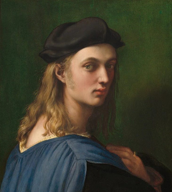 «Портрет Биндо Альтовити» из Национальной галереи искусства в Вашингтоне. Рафаэль выбрал очень необычную, новаторскую для того времени позу для портрета красавца банкира, напоминающего скорей поэта, а не того, кто ссужал деньги Ватикану. Но, может быть, поза, этот резкий поворот головы через плечо, так называемая змеевидная фигура, говорит нам о характере этого человека. А может быть, это был просто дерзкий новаторский художественный прием, который внес динамику в статичную композицию портрета. Но результат потрясает. Как сказали бы современные критики, в этой работе Рафаэль блестяще работает с напряжением в кадре.