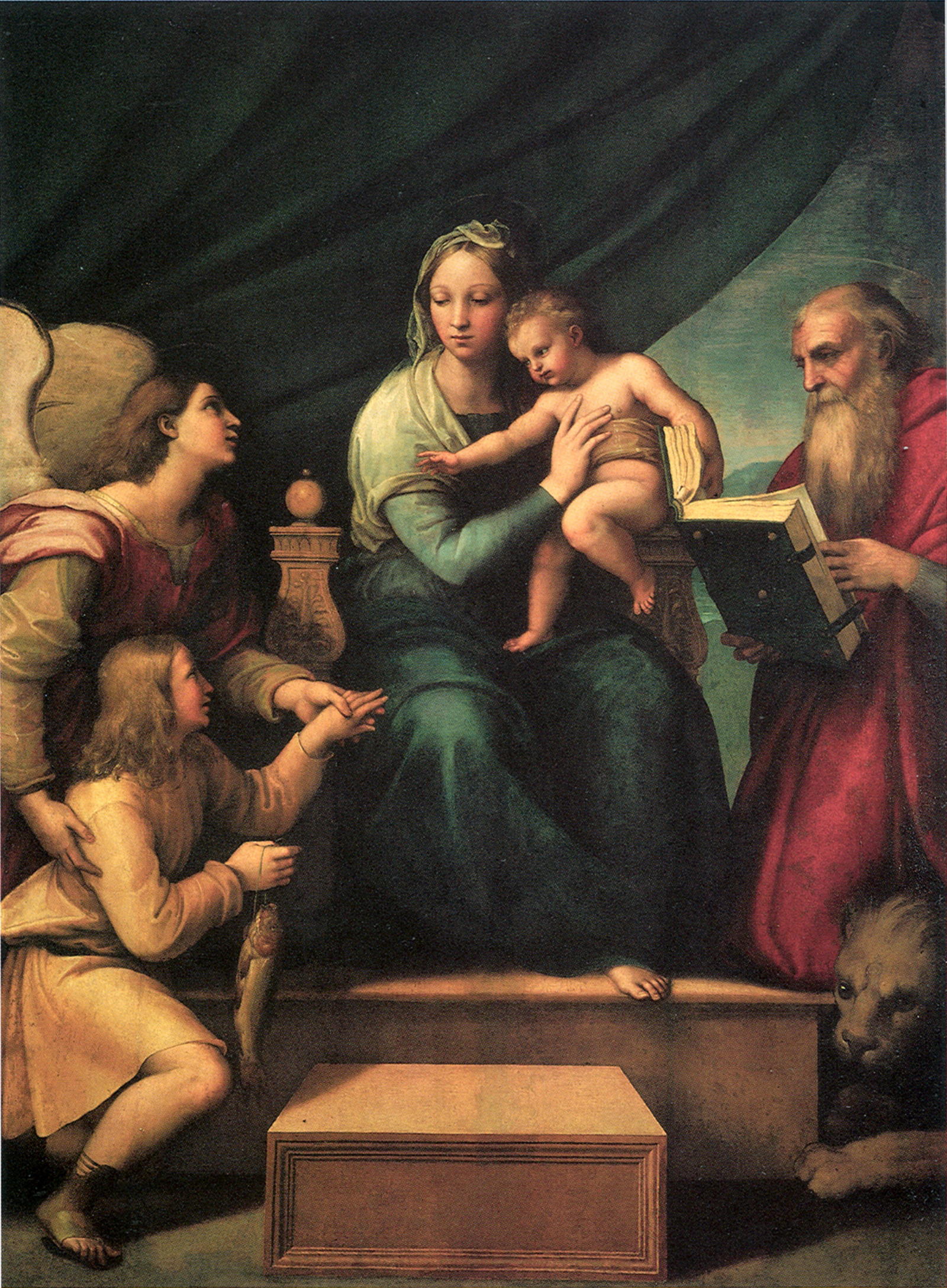 «Мадонна с рыбой» (The Madonna del Pesce) — потрясающее алтарное полотно, где образ Мадонны вписан в сложную сюжетную сцену. Здесь Рафаэль выступает как гениальный режиссер света и цвета. Это зрелая работа, где Мадонна восседает на троне, а вокруг нее разворачивается целая история с архангелом Рафаилом и Святым Иеронимом. То, как написаны складки тканей и как взгляды персонажей перекрещиваются, создавая невидимые линии напряжения внутри кадра, — это настоящий мастер-класс по выстраиванию визуальной иерархии в многофигурной постановке.