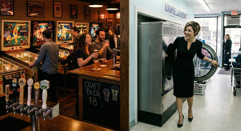 Это не машина. Это портал. Шаг внутрь, легкий толчок дверцы — и стерильный гул прачечной сменяется оглушительным звоном пинбольных автоматов. Никаких вывесок. Только лучшие автоматы в городе и крафтовое пиво по 8 долларов за банку. Пить дешевый лагер в прачечной, стоя в шелковом платье — это, черт возьми, очень по-нью-йоркски.