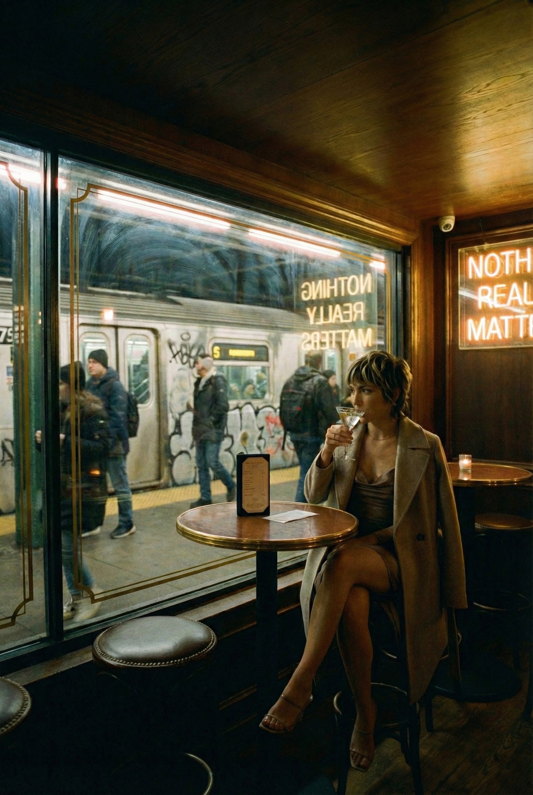 И вдруг, прямо перед турникетами — неприметная дверь. За ней не комната дежурного, а неоновый футуризм. Сидеть здесь — странное удовольствие. Ты находишься в чреве города, в самом его шумном месте, но пьешь идеальный Martini за 22 доллара (плюс налог и чаевые), защищенная от хаоса толстым стеклом. Это идеальная метафора жизни в Манхэттене: найти свой дорогой пузырь комфорта посреди неприглядной реальности.